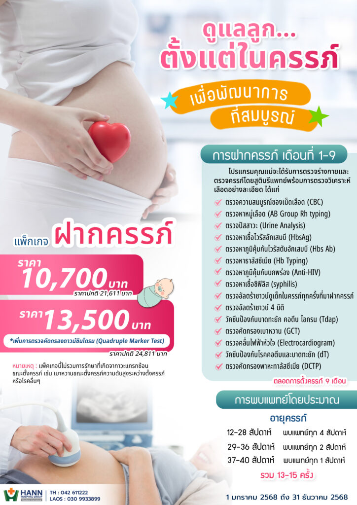 ฝากครรภ์ เป็นจุดเริ่มต้นของการดูแลลูก และสุขภาพคุณแม่ เพื่อพัฒนาการที่สมบูรณ์ และให้ลูกคลอดออกมาได้อย่างปลอดภัย และยังเป็นการลดความเสี่ยงที่อาจเกิดขึ้นกับคุณแม่และลูกน้อย การได้พบสูติแพทย์จะช่วยให้คุณแม่ได้รับคำแนะนำเกี่ยวกับการดูแลสุขภาพ โภชนาการ ไปจนถึงการออกกำลังกาย และสามารถสอบถามหรือปรึกษากับสูติแพทย์ได้โดยตรงอีกด้วย